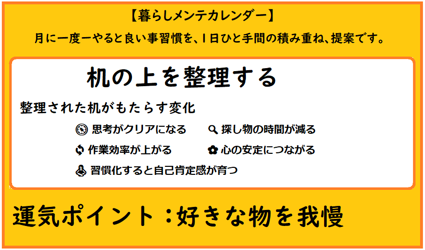 もし今、少しだけ気持ちが散らかっていると感じているなら、机の上を整えてみるのもひとつの方法です。 それは、外側の環境を通して内側の自分を整える、静かなセルフケアのようなもの。 ほんの数分でも、机の上を整えることで、今日のあなたの気持ちが少しだけ軽くなるかもしれません。