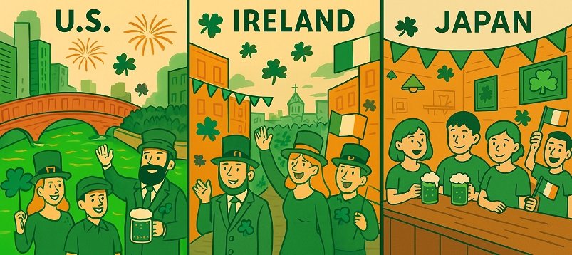 表参道や横浜のパレード、アイリッシュパブの限定イベント、緑のライトアップ…。 日本にいながら、アイルランドの祝祭の“空気”はちゃんと味わえるのよ。 家でミニ祝祭を開くのもアリで、気軽に参加できるのが魅力。
