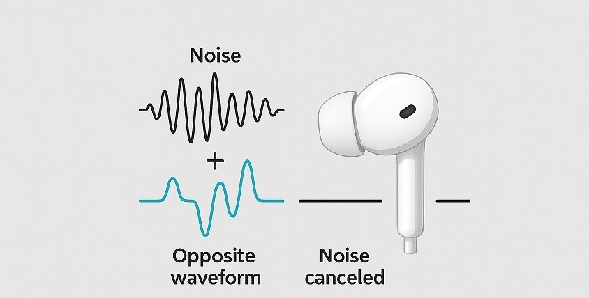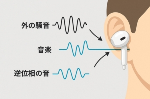 「外の騒音・逆位相の音・音楽」の3つの波音が耳の中で騒音だけを打ち消し、音楽だけが残る様子を視覚的に表現したイメージ。