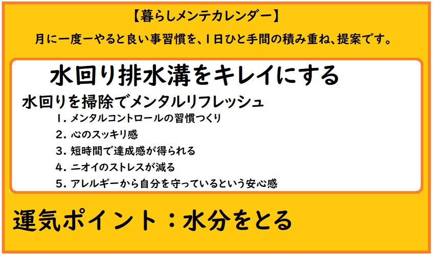 さらに、この習慣は健康面でもしっかり役立ちます。水回りは湿気・温度・皮脂や石けんカスといった“菌の三大好物”が揃っている場所。実は家の中で最も菌が増えやすいエリアなんです。言い換えると、菌にとってはテーマパークのような環境。だからこそ、月1で軽く整えておくだけでも、ぜんそくやアレルギー、ウイルスのリスクを減らし、家族の健康を守ることにつながります。