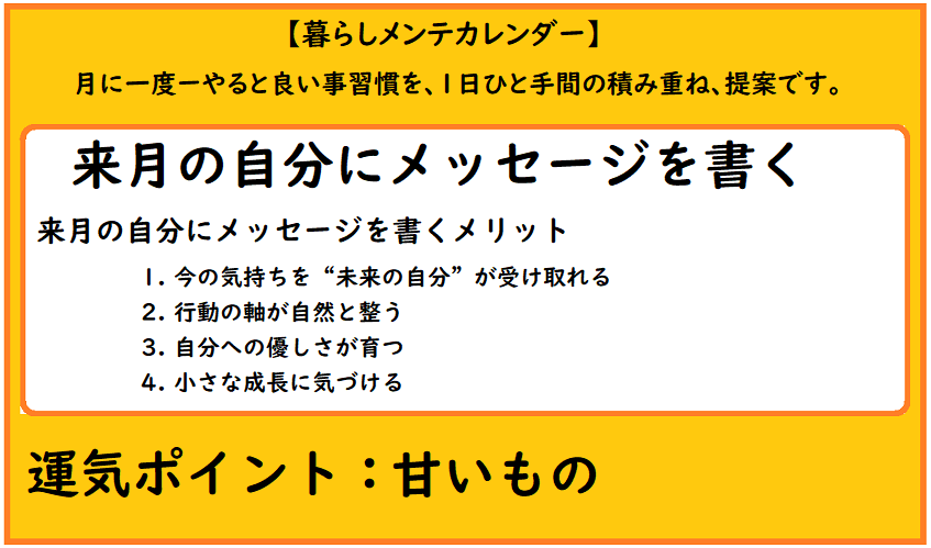 もし今、少しだけ立ち止まりたい気持ちがあるなら、来月の自分に向けて数行のメッセージを書いてみてください。 それは、未来のあなたを励ます小さな贈り物になります。 そして同時に、今のあなたの心をそっと整えてくれる時間にもなるはずです。